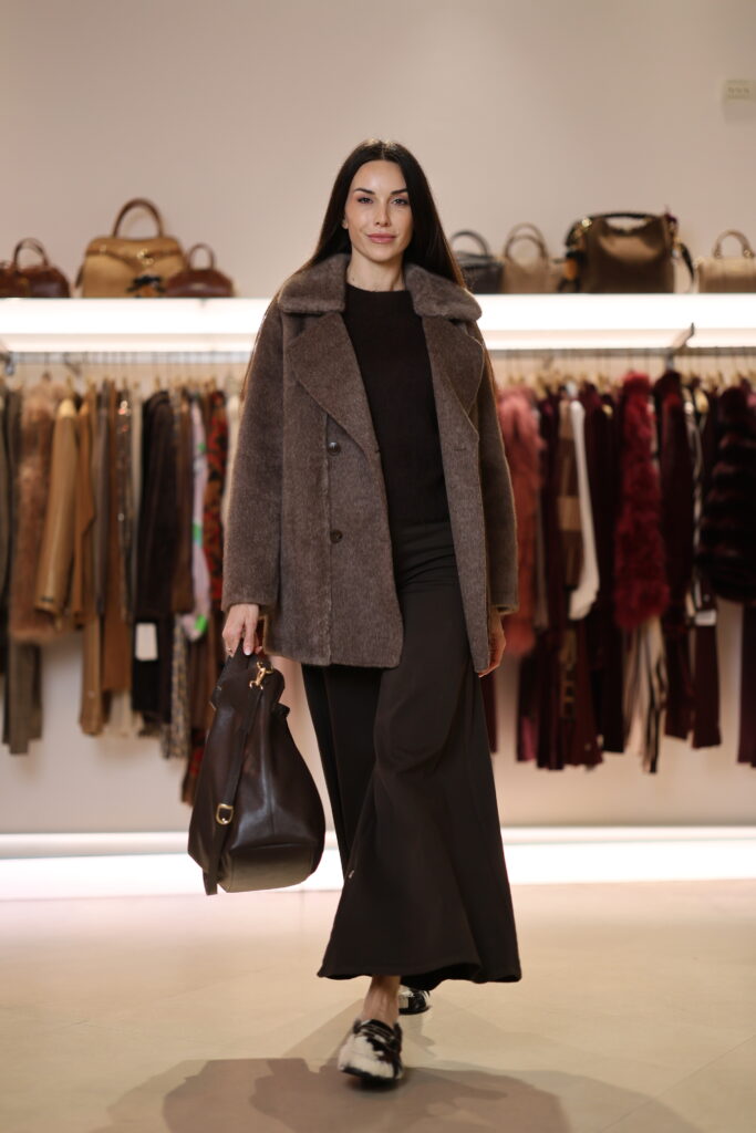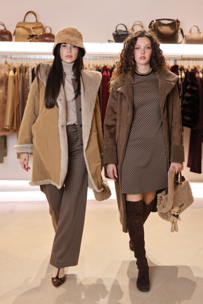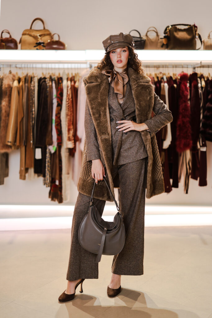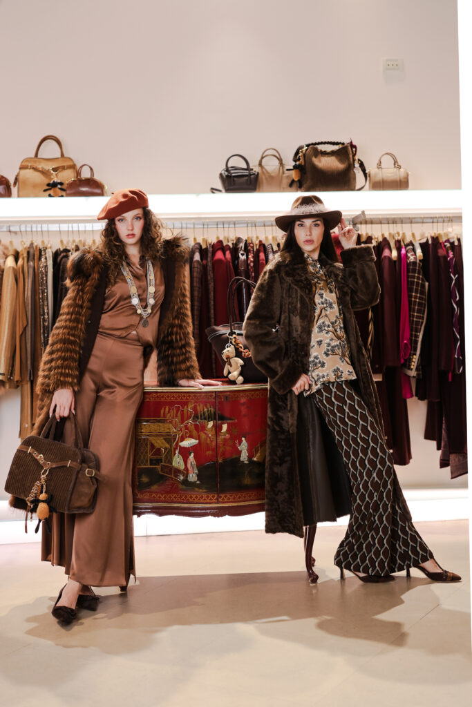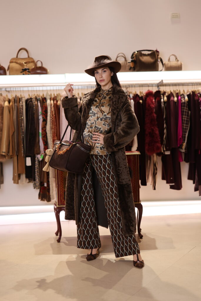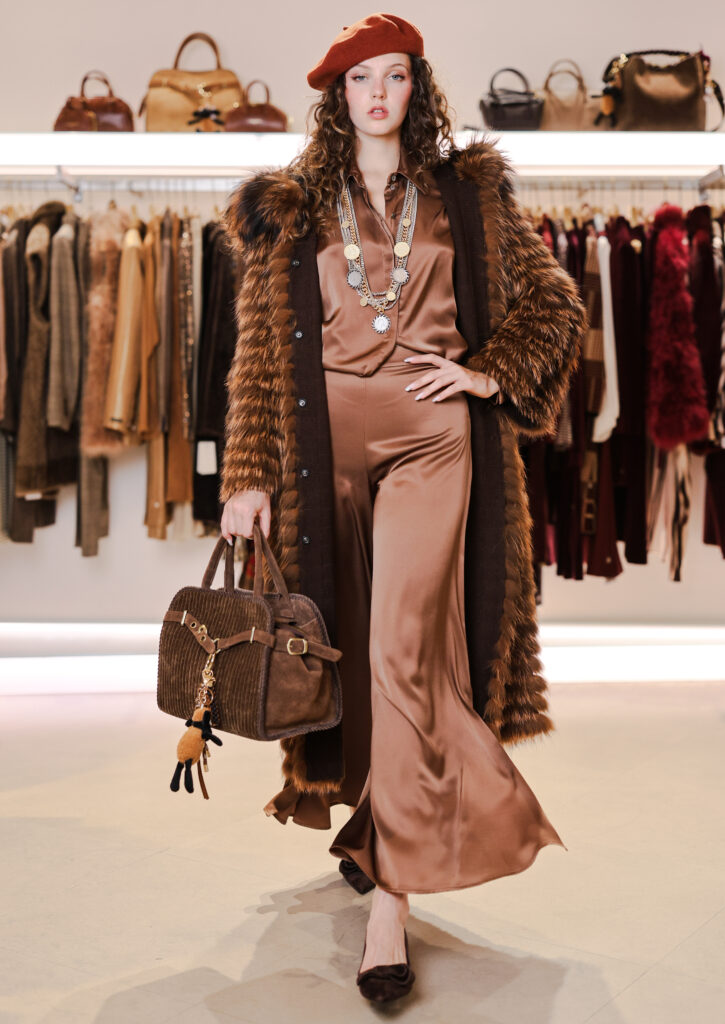 I colori della terra si accendono delle avvolgenti sfumature delle spezie: completi pantaloni in fantasie mix and match, cappelli con sbuffi di romantiche piume, gilet, cappotti in pelo ecologico caldissimo, scarpe tanghere, stivali sopra al ginocchio in morbido e iconico camoscio Stuart Weitzman e borse in in irresistibile teddy.