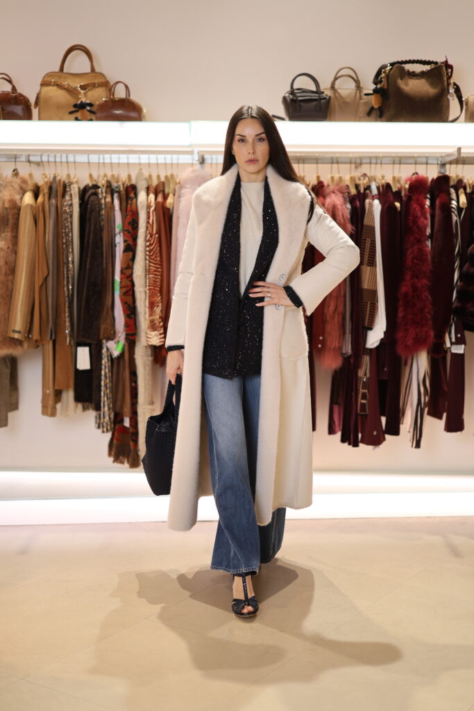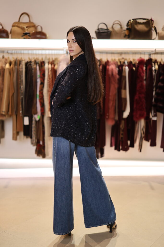 Il mare è caldo anche d’inverno se è in morbida lana illuminata da discrete paillettes su blazer destrutturati e giacche corte e grintose abbinate a jeans dalla vita alta e dalla zampa larga, in classico denim o spalmati in modo che risulti di un blu intenso e lucido.  La leggerezza delle piume è il tocco inaspettato che rende frizzante l’intramontabile accostamento blu, bianco, jeans.  Irrinunciabile, soprattutto a Genova, ma proposto in chiave ultra contemporanea.
